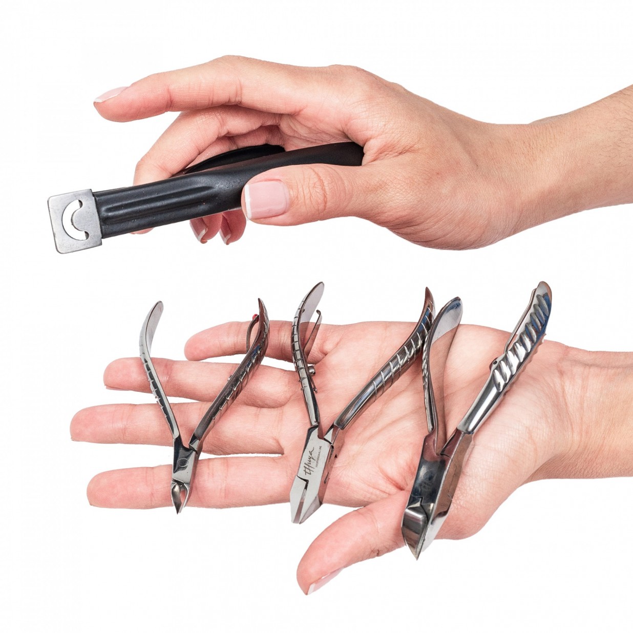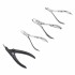 Cuatro alicates profesionales para minicuría en un hermoso y cómodo estuche para guardar estas herramientas.